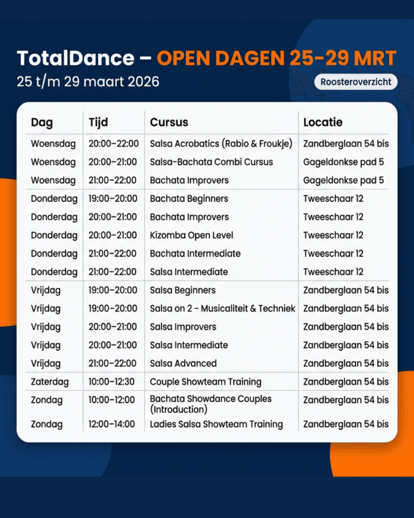 Open dagen bij Total Dance in Breda zijn hét moment om te ervaren hoe leuk, gezellig en uitdagend dansen is! Tijdens de open dag kun je kosteloos kennismaken met onze lessen Salsa en Bachata . Of je nu een beginnende danser bent of al ervaring hebt, onze gratis workshops bieden voor ieder niveau iets nieuws. Onze docenten staan klaar om je de basisbeginselen van deze populaire dansstijlen bij te brengen, maar ook om gevorderde dansers uit te dagen met meer complexe bewegingen en technieken. Tijdens de open dagen maak je niet alleen kennis met de dansstijlen, maar ook met de warme en gezellige sfeer die onze dansschool kenmerkt. Je ontmoet mededansers met dezelfde passie en maakt nieuwe vrienden in een ontspannen omgeving. Dus, waar wacht je nog op? Schrijf je nu in voor onze gratis workshops en reserveer jouw plek op onze open dag. We kijken ernaar uit om je te verwelkomen en samen een geweldige danservaring te beleven!
